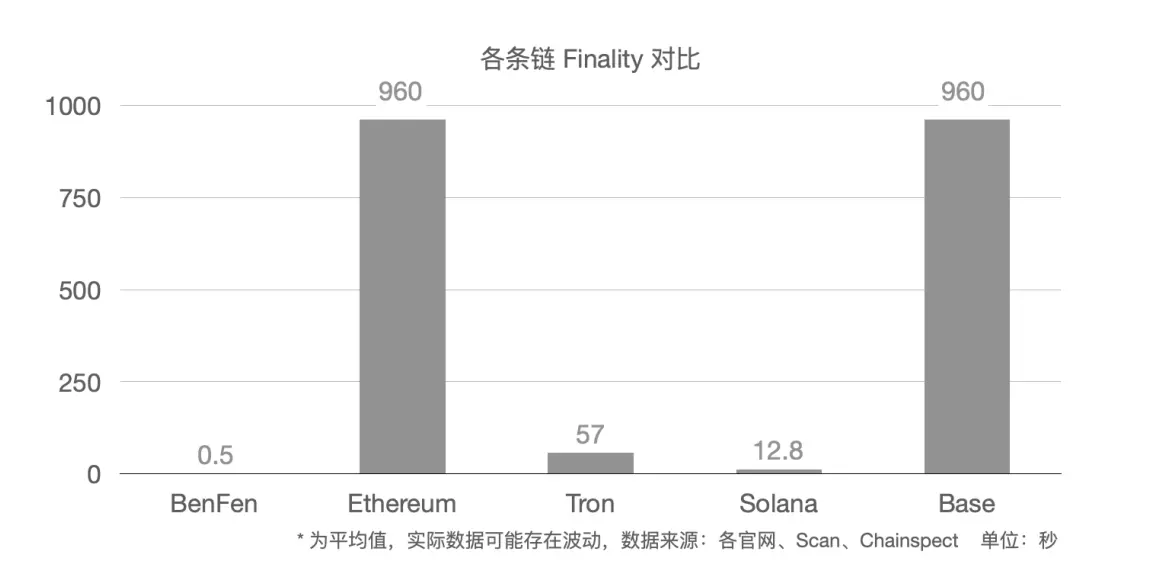 在 Finality 方面,BenFen 链由于是单链结构,Finality 几乎和时延一致,处于优势地位。Finality 意味着真实记录在区块链上的时间,Finality 越短意味着从交易到入账(上链)的时间越短,其安全性、可靠性也就越高,用户的体验也就越好。