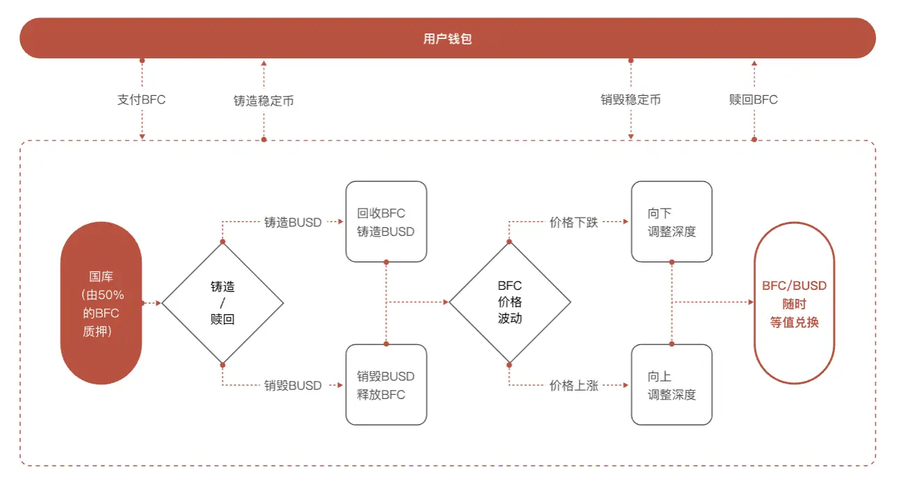 在铸造 BUSD 时,BenPay DEX 将会回收 BFC;在销毁 BUSD 时,BenPay DEX 将会释放 BFC。在这个过程中,BFC 的价格必然会出现波动,当价格下跌时,系统向下调整深度;当价格上涨时,系统向下调整深度。在用户端的体验方面,用户支付 BFC 获得稳定币;用户赎回 BFC,系统则销毁稳定币。