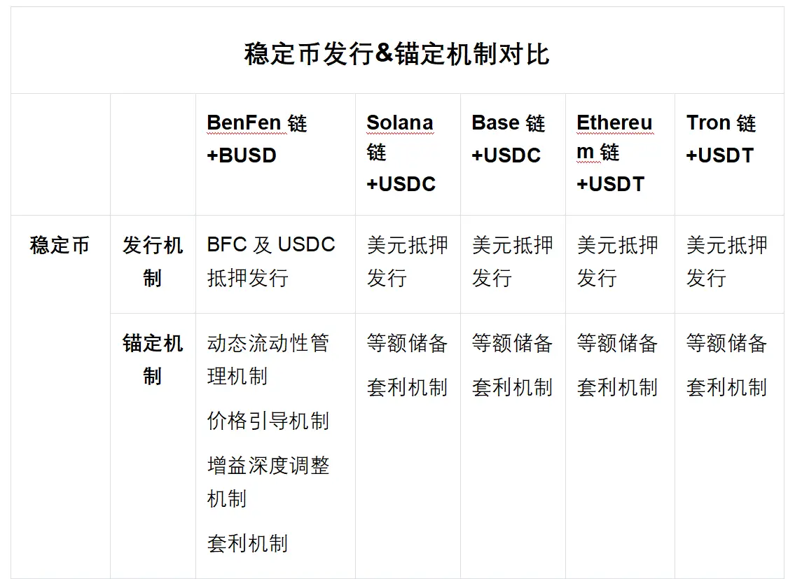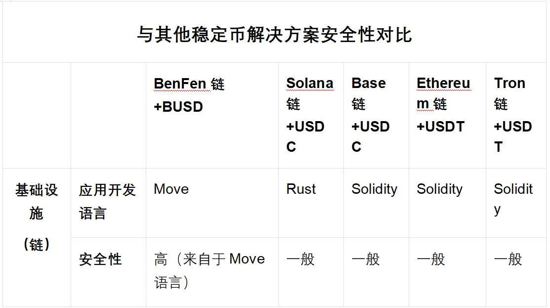 BenFen 链+BUSD 的解决方案,专注于稳定币应用场景,包括 PayFi、Card、Gas 费支付、P2P等,而其他链及稳定币针对的是全部的生态应用,包括 DeFi、GameFi、Social、Meme、AI等,缺乏足够的专注性。