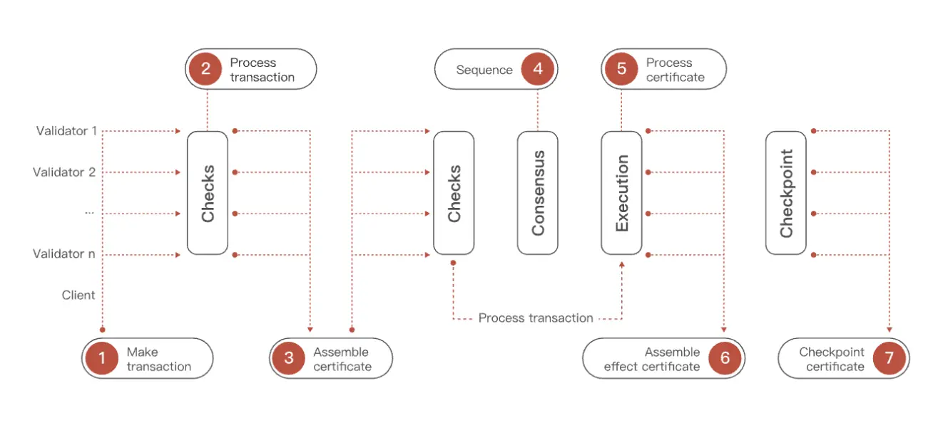 为了实现更高的性能和更低的 Gas 费,BenFen 链将基于 DAG 的共识与无共识相结合,用户利用其私钥创建和签署交易时,交易将被发送至本分的每个验证者。之后,验证者会进行一系列有效性检查,将已签名的交易返回客户端,之后,客户端收集大多数验证者的回复以形成交易证书。