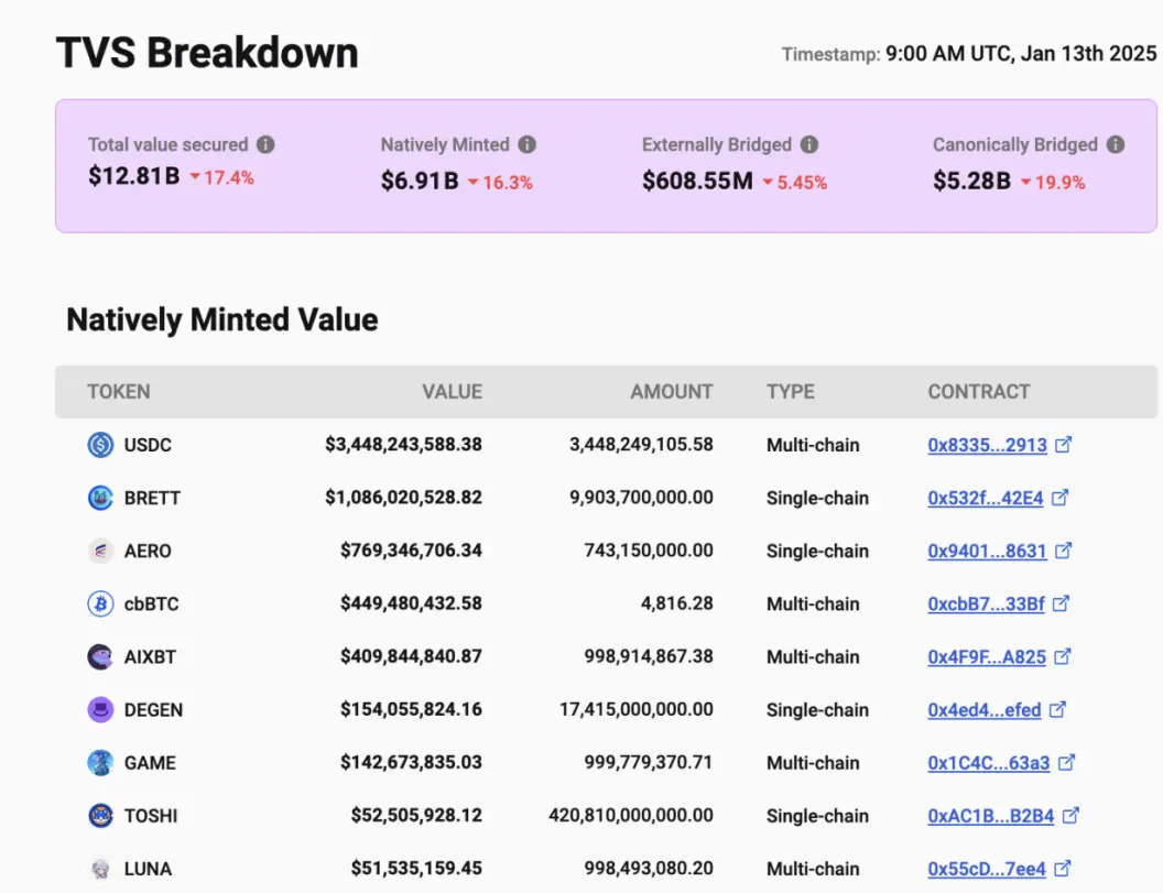 随着 Coinbase 持续发力 Base 链,Base 链上的资产总价值已经达到了 128亿美元,价值最大的为 USDC,共有 34.48亿美元。