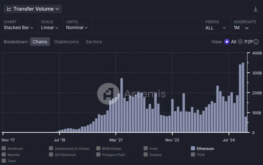 USDT 在 Ethereum 链上的结算额(月) 来源:Artemis