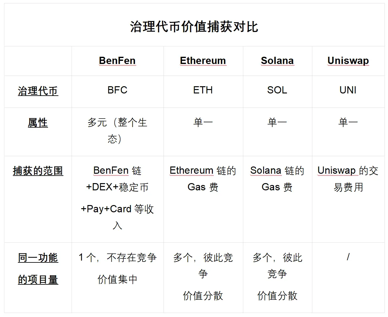 相比其他的链和应用分散的价值捕获机制,比如 ETH 捕获的是 Ethereum 链的 Gas 费、UNI 捕获的是 Uniswap 的交易费用,BenFen 的治理代币 BFC 可以完整捕获整个生态的价值,包括 BenFen链、BenPay DEX、BenPay、BenPay Card、商户服务等完整的生态。因此,其价值为所有生态项目价值之和,含金量更高。