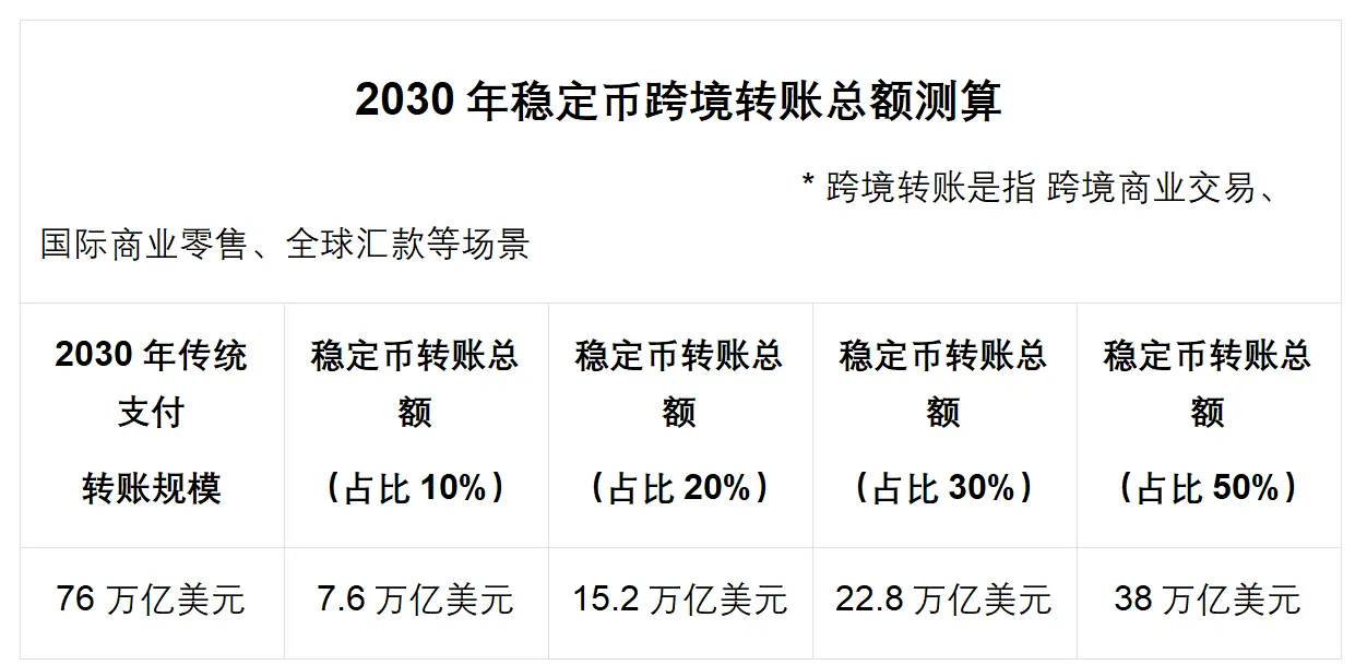 规模与潜力:至2030年稳定币转账总额或可达38万亿美元/年