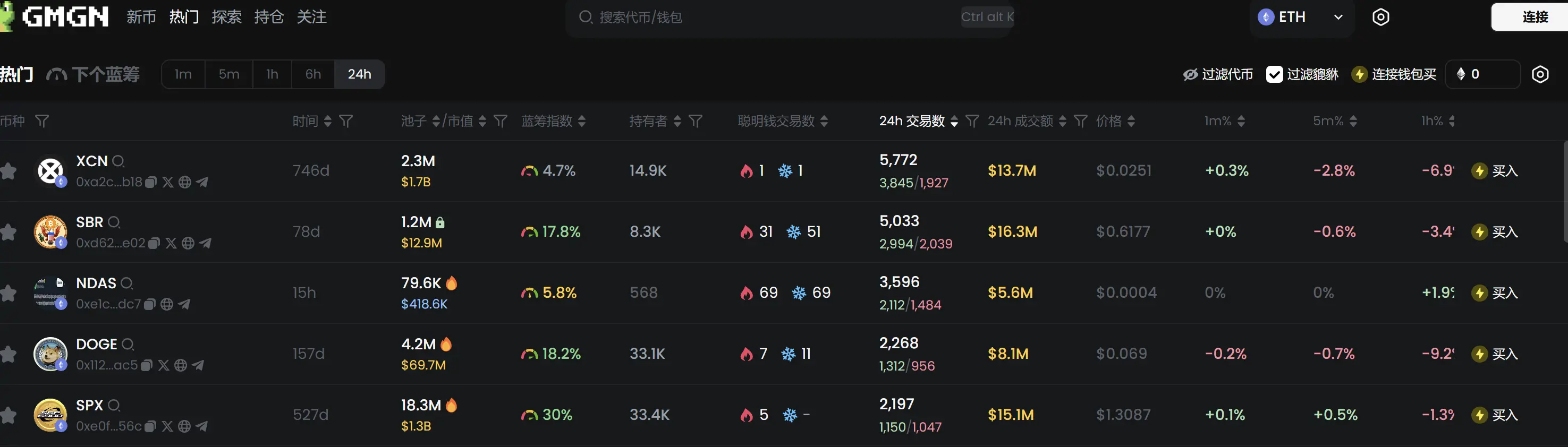 过去 24h 以太坊热门代币前五依次为:XCN、SBR 、NDAS 、DOGE、SPX