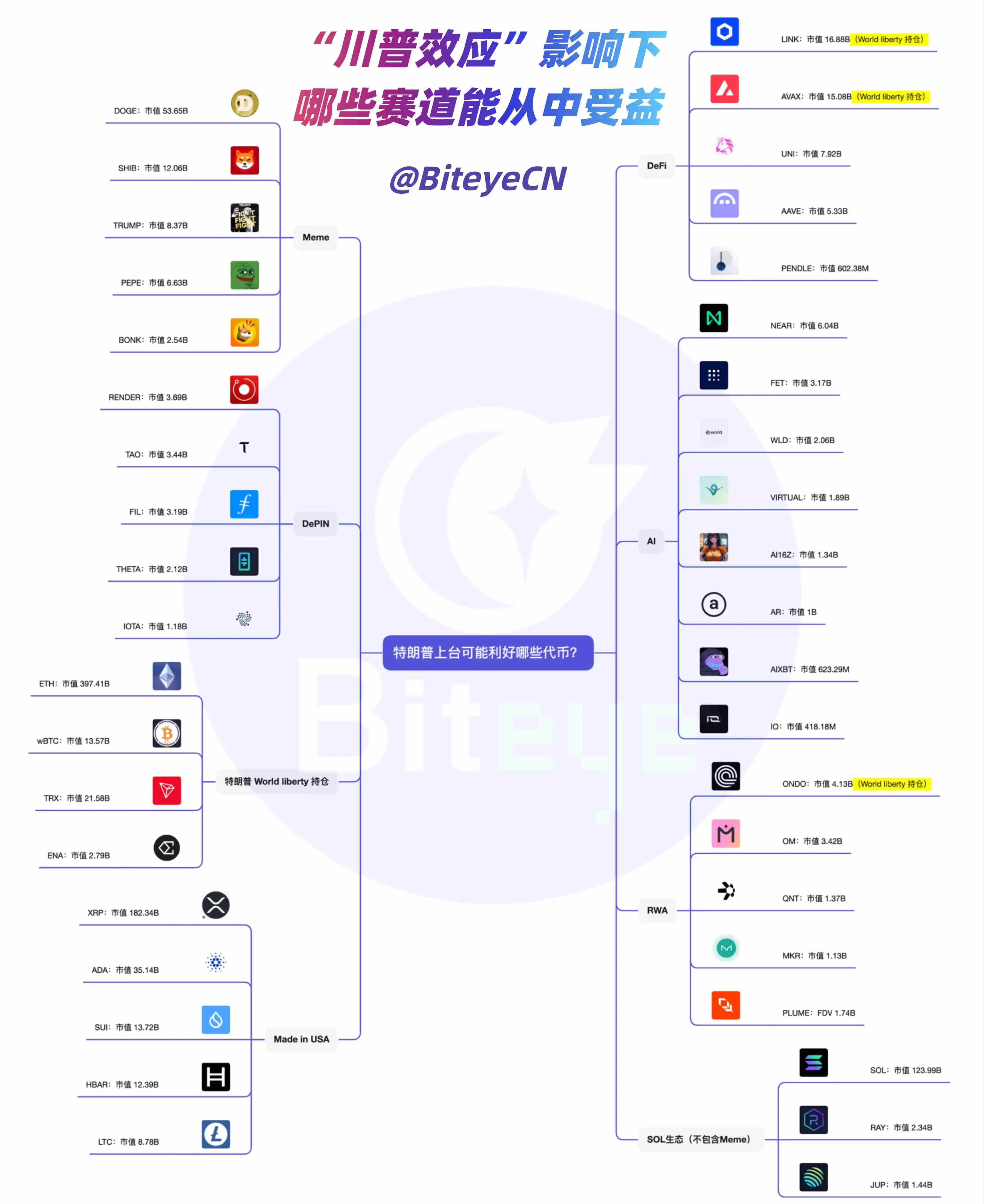 和拜登政府的监管思路相比,特朗普的政策大刀阔斧,或许能让那些原本被监管阴影笼罩的项目迎来久违的春天。从 DeFi 到 AI,再到 MEME 币,这些赛道能否在「川普效应」的推动下迎来新一轮的爆发?他是否能如同上次引领「$Trump 发币潮」般,让市场猝不及防?