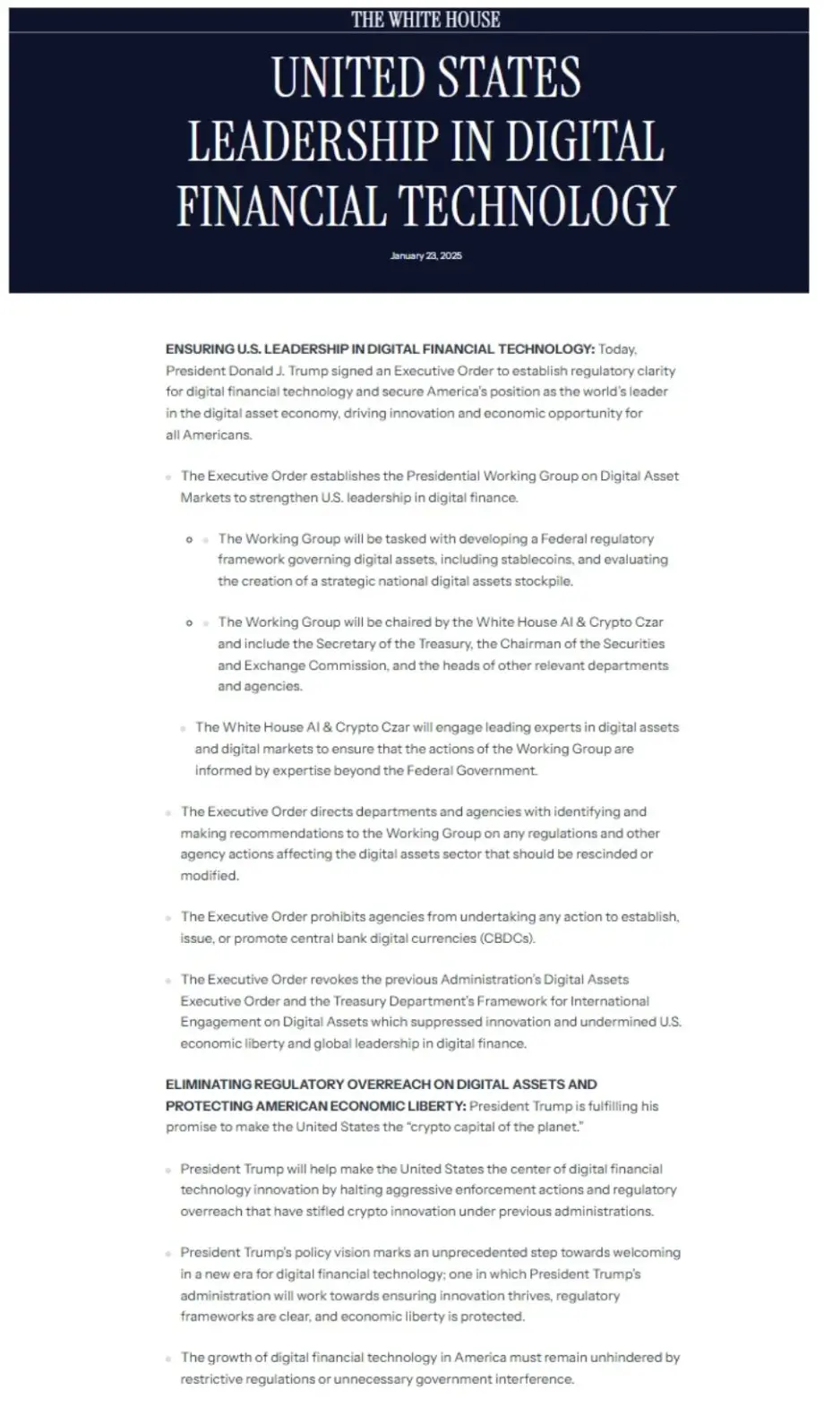 昨日(2025 年 1 月 23 日)特朗普在白宫签署了备受瞩目的行政命令,正式宣布美国将在人工智能(AI)和数字加密货币领域加大政策支持。这不仅意味着特朗普有意推动美国在全球 AI 竞赛中占据领先地位,还释放出对加密货币领域的积极信号。