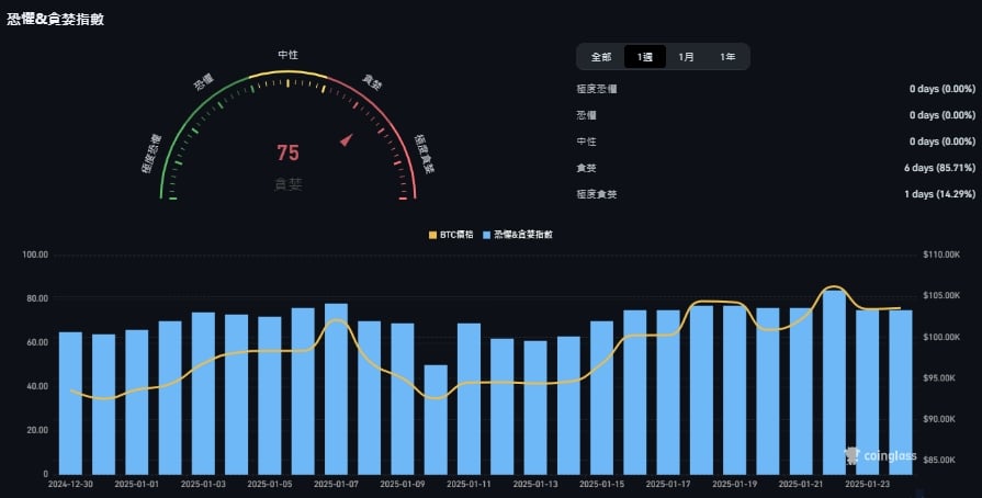本周的市场情绪 指标 从 77 (贪婪)至 75 (贪婪)区间,整周都在(贪婪)与(极度贪婪)区间。