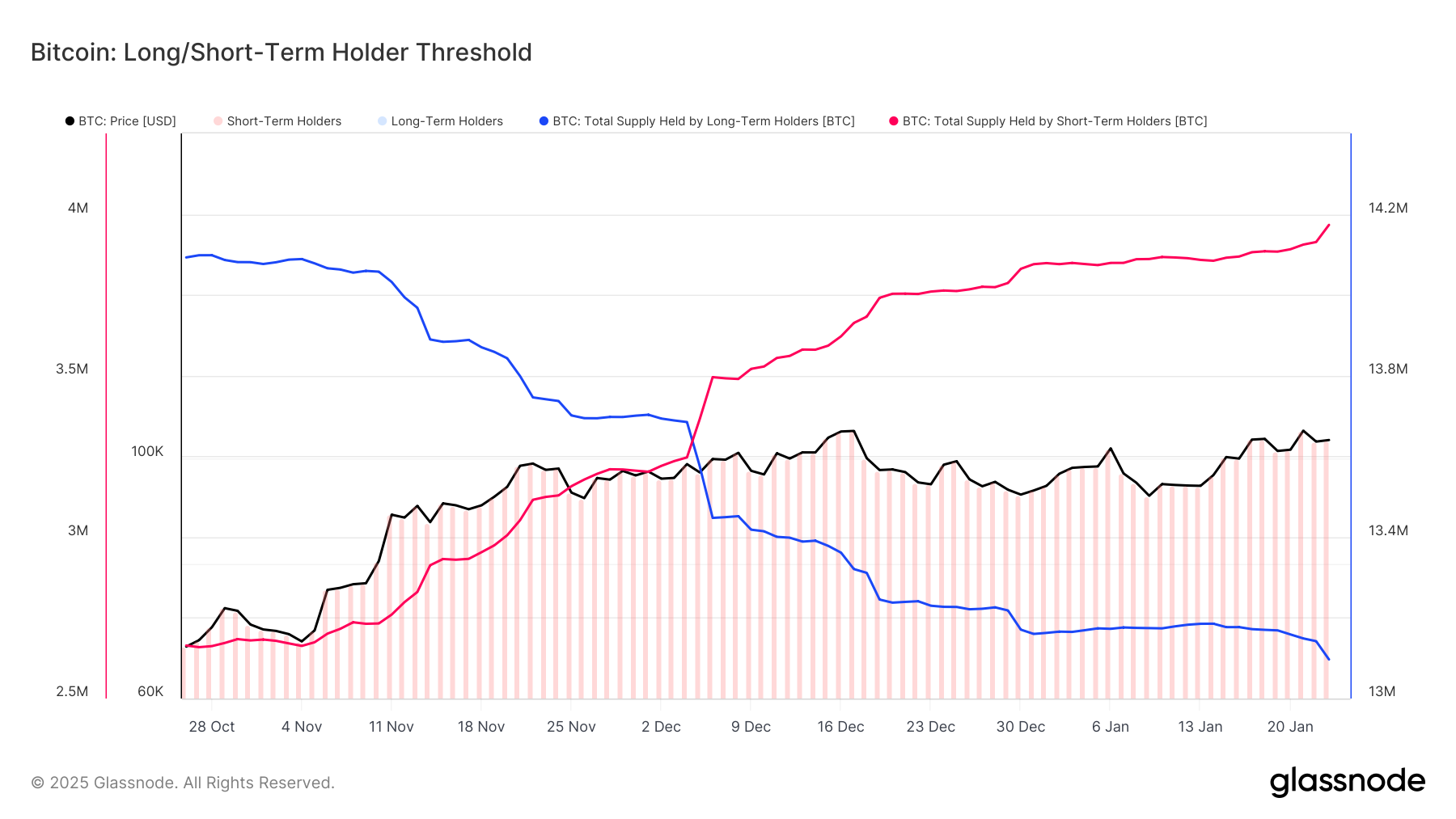 根据链上 数据 ,比特币短期持有者供应量本周持续上升,表明市场交易活动增加,显示更多资金正在流入短期持仓中。与此同时,长期持有者供应量逐渐下降,反映部分资金选择获利了结。