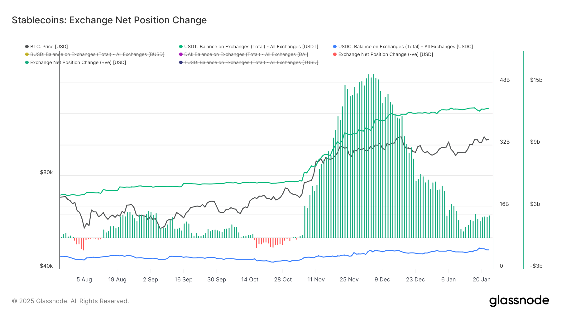 数据 显示 ,本周交易所资产呈现净流入状态,表明投资者可能正为即将到来的市场波动做準备。资金流入交易所通常被视为短期内购𧹒需求可能提升的指标。