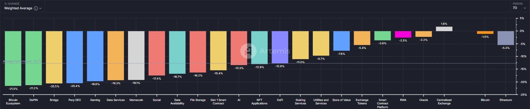 Artemis 数据 显示 ,本周区块链领域板块的平均涨幅为 -12.7% ,表现最佳的三个领域分别为 Centralized Exchange(1.8%) 、 Oracle(-2.2%) 和 RWA(-2.5%) 。