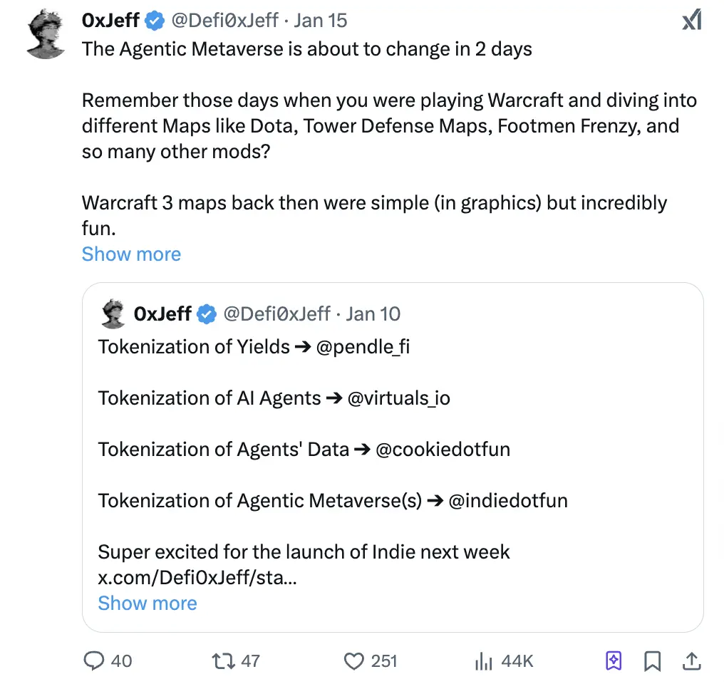 Indie 正在将自己定位为“Agentic 元宇宙”的 Launchpad,使 Web3 游戏能够同时发布其游戏、AI 智能体和代币。最近,Indie 宣布与 @ARCAgents 建立合作关系,利用 ARC 的强化学习技术来增强 AI 智能体的能力。这种技术集成使得智能体能够更具互动性和动态性,从而显著提升 Indie 游戏中的玩家体验。