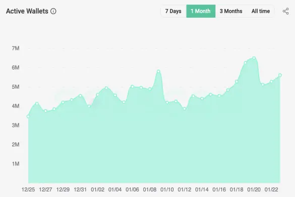但这次热潮是否真正为加密市场注入了新的流动性,仍值得商榷。从市场表现来看,短时间内,几乎所有其他链上项目都出现了不同程度的下跌。相比之下,Solana 因为强劲的交易需求逆势而上,其价格突破历史新高。同时,链上活跃钱包数在 1 月 19 日达到近一个月的峰值。这种极化现象显示出市场流动性在面对单一热点时的脆弱性,也暴露了链上生态的一些深层次问题。
