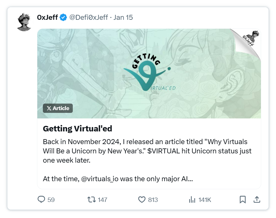去年,当人工智能代理(AI agents)的叙事逐渐兴起时,@virtuals_io 成为首个推动 AI 代理Token化概念的创新型启动平台。Virtuals率先展示了AI代理Token化的价值,通过Token的价值积累,AI代理的创作者可以为其代理提供初始支持、持续维护以及训练。这一早期的创新使Virtuals巩固了其作为Base链上顶级AI代理分发网络的地位。