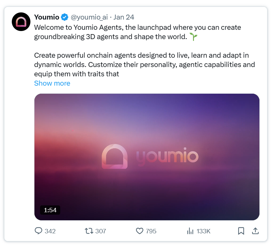 @youmio_ai,最近从“Today”更名而来,打造了一个专为Virtuals和沉浸式游戏环境设计的3D代理创建平台。团队专注于开发精致的3D世界和无代码构建工具,创造出加密领域中最先进的3D模型之一。
