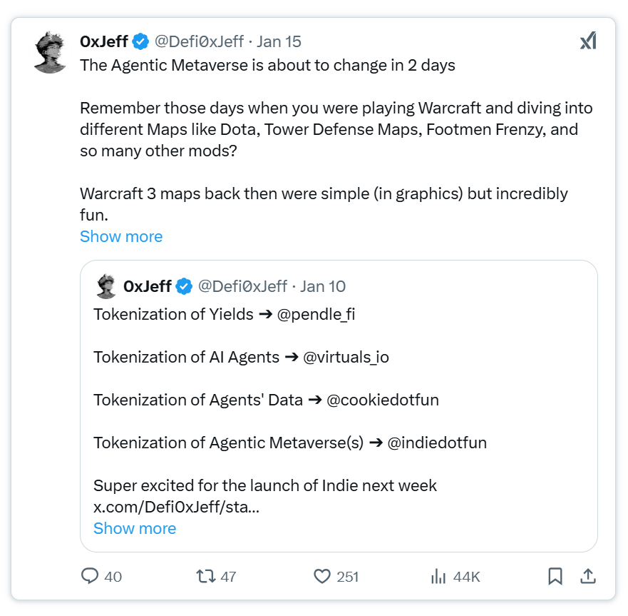 Indie 正致力于打造“Agentic Metaverse”的启动平台,使 Web3 游戏能够同时发布游戏、AI 代理和Token。近期,Indie 宣布与 @ARCAgents 达成合作,利用 ARC 的强化学习(Reinforcement Learning)技术大幅提升 AI 代理的能力。这种技术整合使代理更加互动和动态,从而增强了 Indie 游戏中的玩家体验。