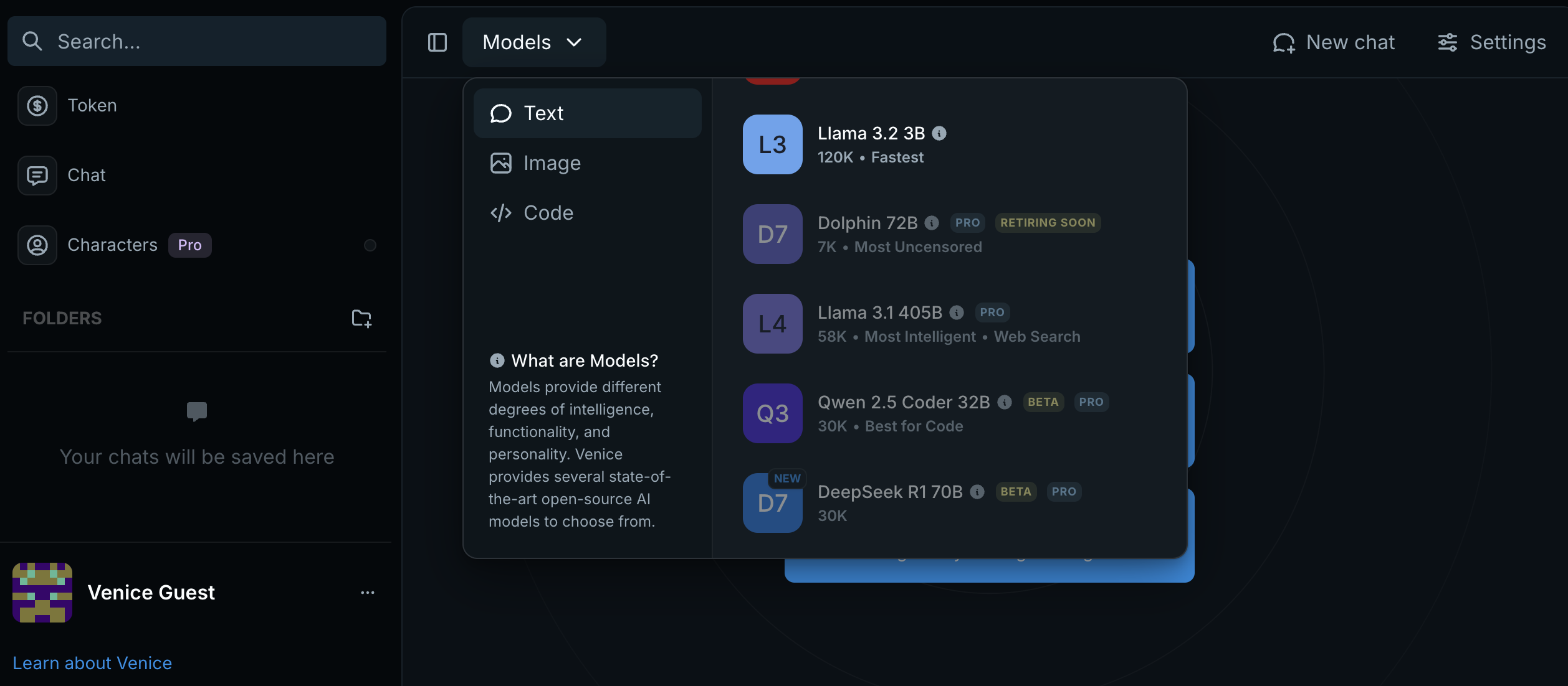 据官网 介绍 ,Venice 是聚合了多个 AI 模型的聊天机器人,包含 Llama 3.3、DeepSeek R1、Qwen 2.5 Coder 等。