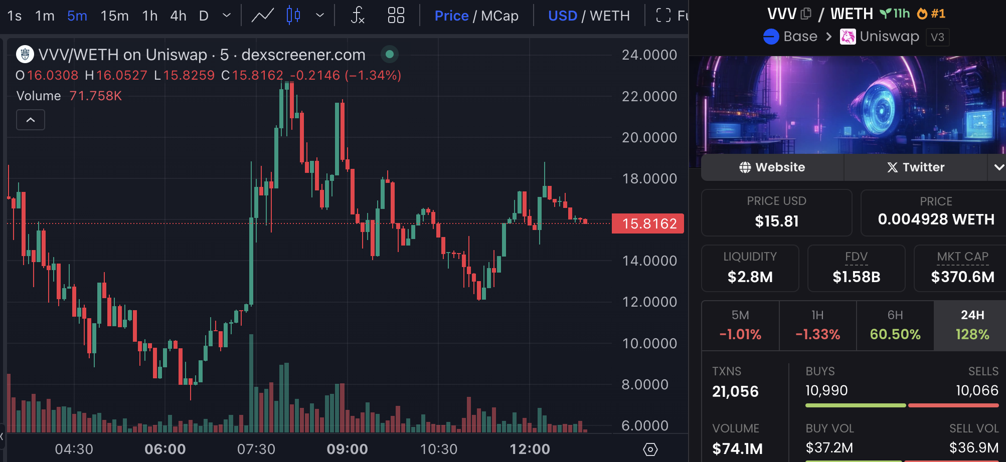 截稿前 $VVV 币价暂报 15.8 美元,市值高达 3.7 亿美元,近 24 小时飙涨 128%。