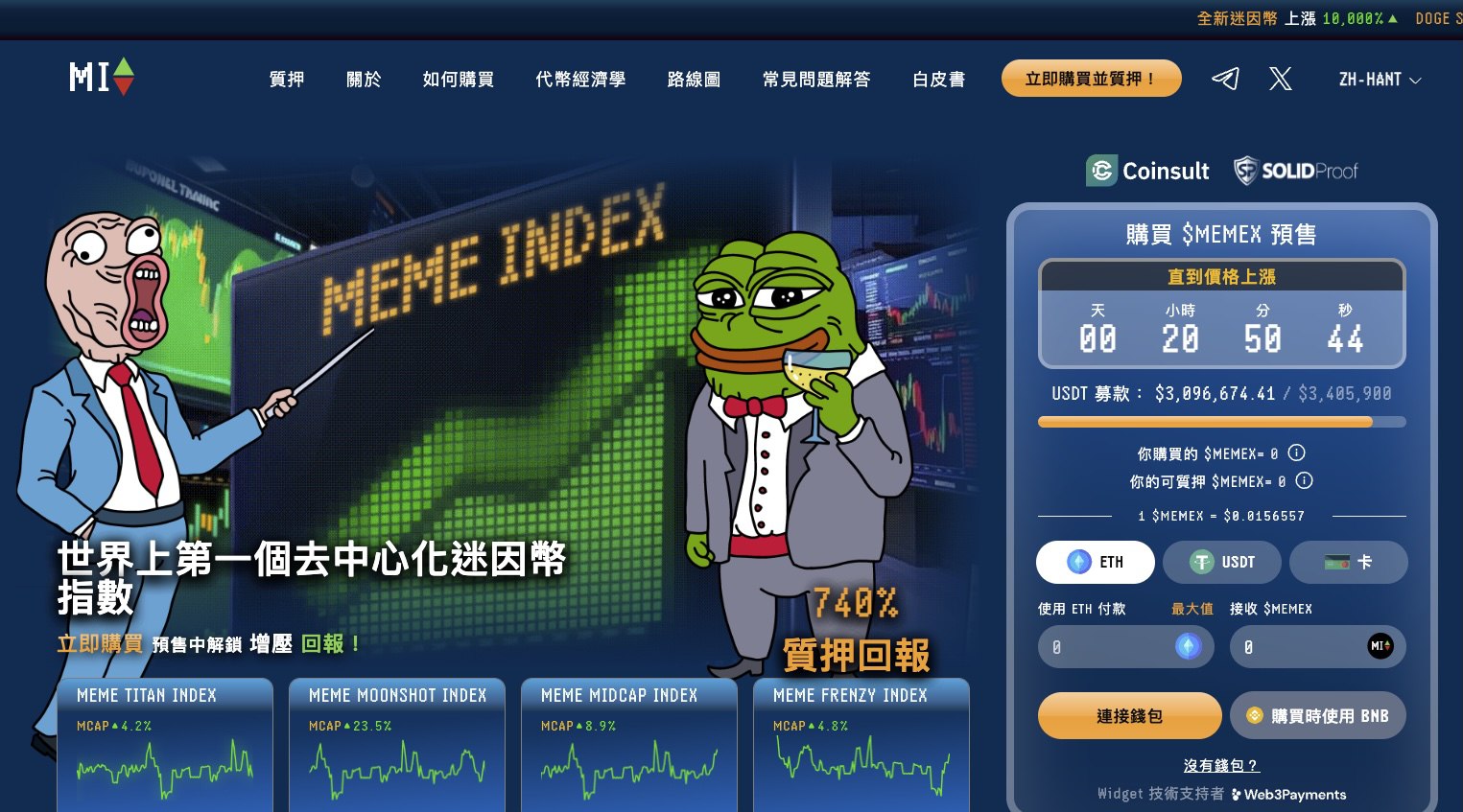 此外,为了保障投资者安全,Meme Index 已通过 Coinsult 和 SOLIDProof 智慧合约审计,进一步增强了市场信任度。目前,$MEMEX 预售正在火热进行中,投资者可以通过官方网站参与,使用 $USDT、$ETH 或 $BNB 购买代币。