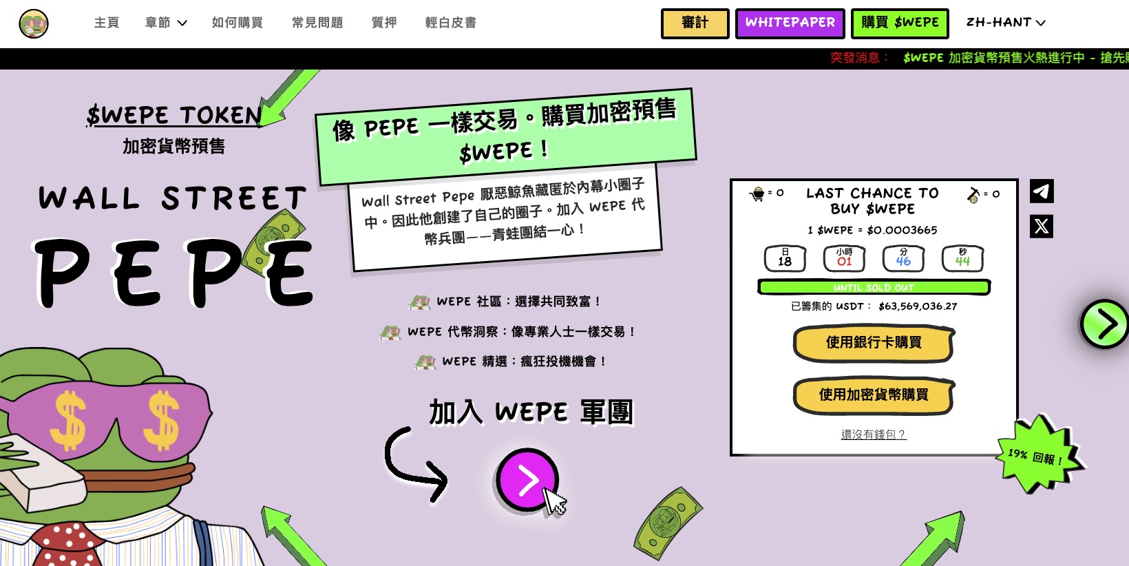 要留意,$WEPE仍在预售阶段,在预售结束后再上市DEX及CEX,建议投资者可进入官方网站、X及Telegram了解预售最新资讯。