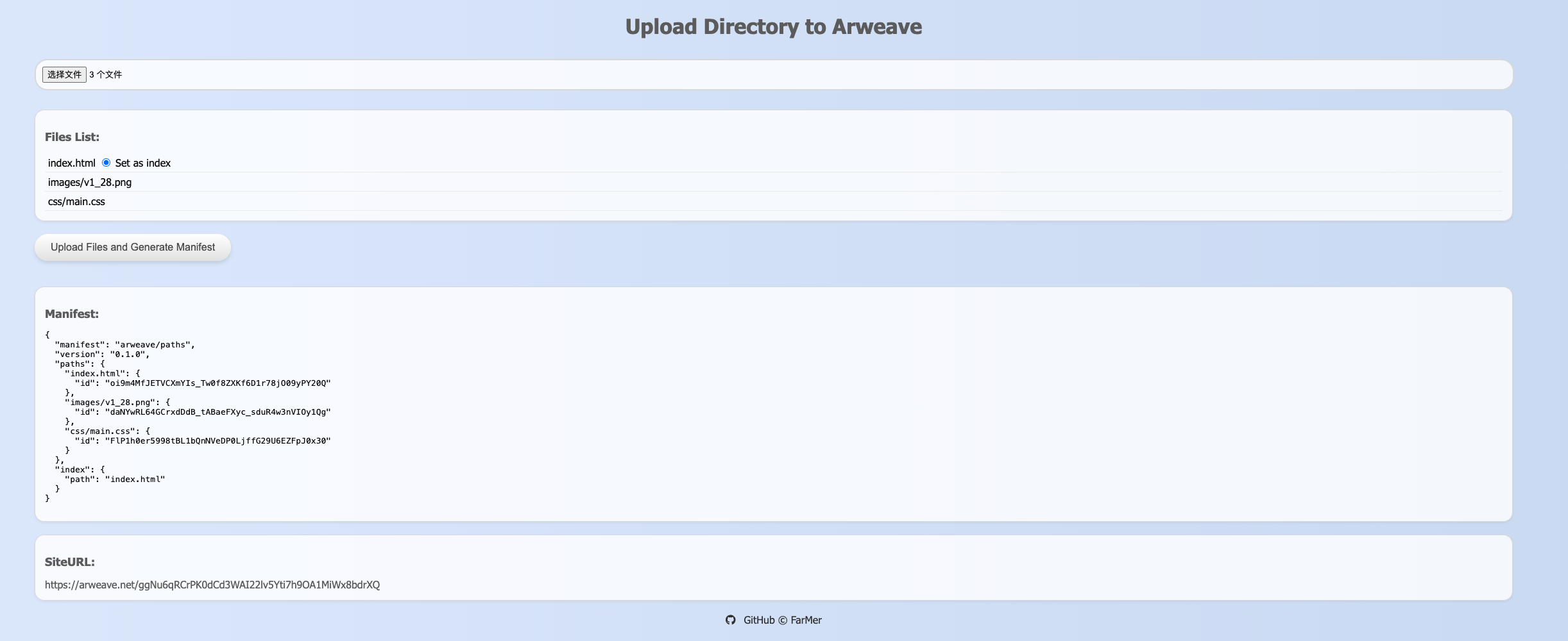 导出网页代码后,首先可以通过直接打开 HTML 文件或者使用 Live Server 先进行本地测试,显示正常无误后将上传代码至 Arweave,Arweave 针对网页文件提供了前端托管,所以将网页文件上传后即可访问。这里直接推荐使用 PermaDAO 社区贡献者 FarMer 制作的一键将网页上传至 Arweave 的工具: SiteUploaderOnArweave。