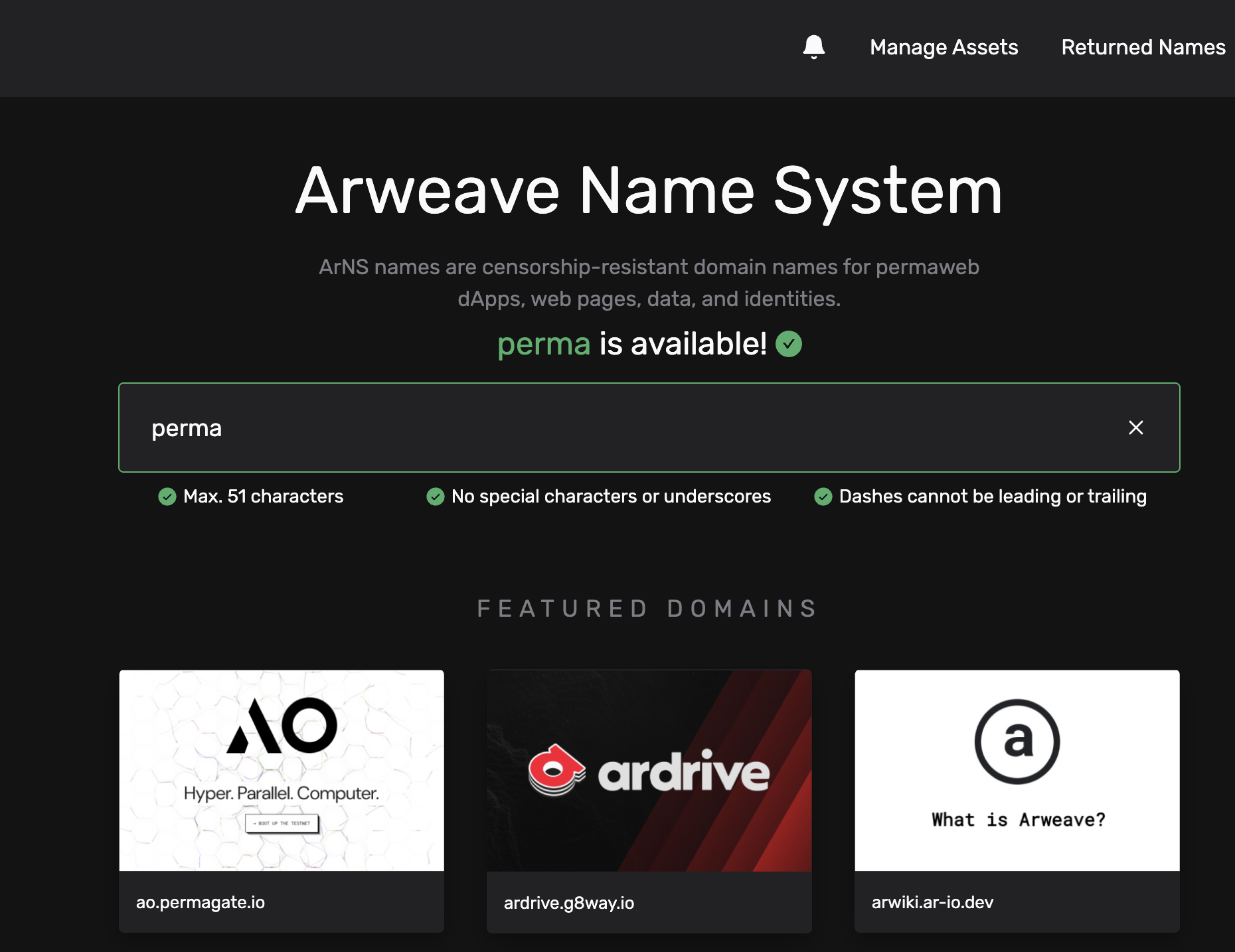 这样的网址可读性非常差,那么是否可以将此哈希改为好记、易用的域名呢?当然可以,使用 ArNS 为 Arweave 区块链上的任何哈希、地址与永久网站提供友好的域名。