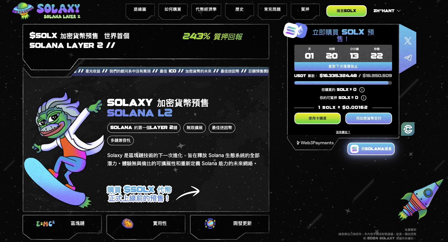 $SOLX仍在预售阶段,在预售结束后再上市DEX及CEX,建议投资者可进入官方网站、X及Telegram了解预售最新资讯。