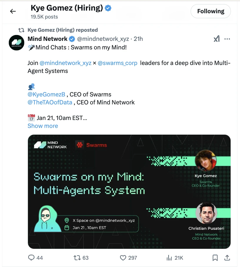 在这一过程中,Mind Network 凭借其在 FHE 与 AI 结合方面的领先技术,展现出了巨大的潜力。通过为多智能体系统提供安全、高效的加密计算支持,Mind Network 不仅增强了数据隐私保护,还推动了 AI 协作的创新。同时,Swarms 团队也通过 FHE 进一步推动了多智能体协作的能力,构建了更加安全和高效的共识框架。随着 FHE 技术的进一步发展,AI 与加密技术的融合将成为未来数字世界的一个重要发展趋势。