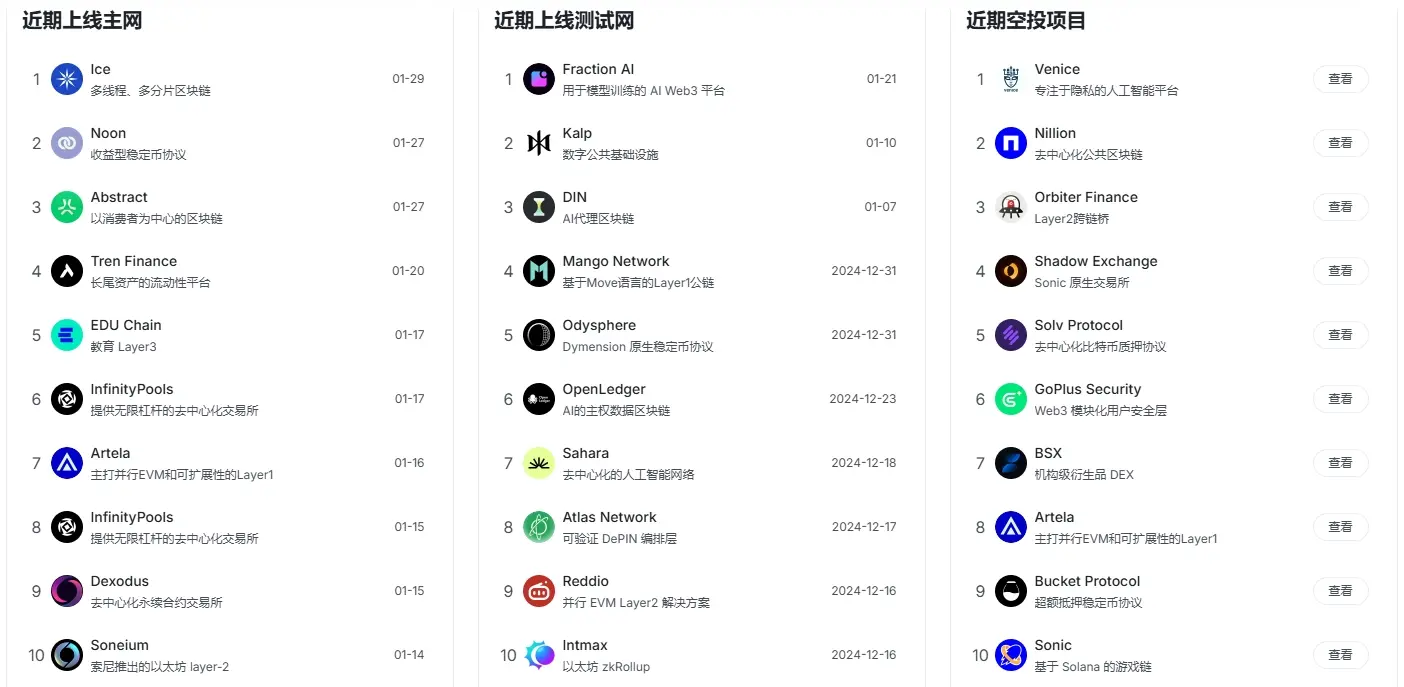 在 1 月,RootData 还记录了许多项目的主网上线、新币发行等事件,帮助用户了解市场上重要的项目动态,掌握更早期的 alpha 机会。