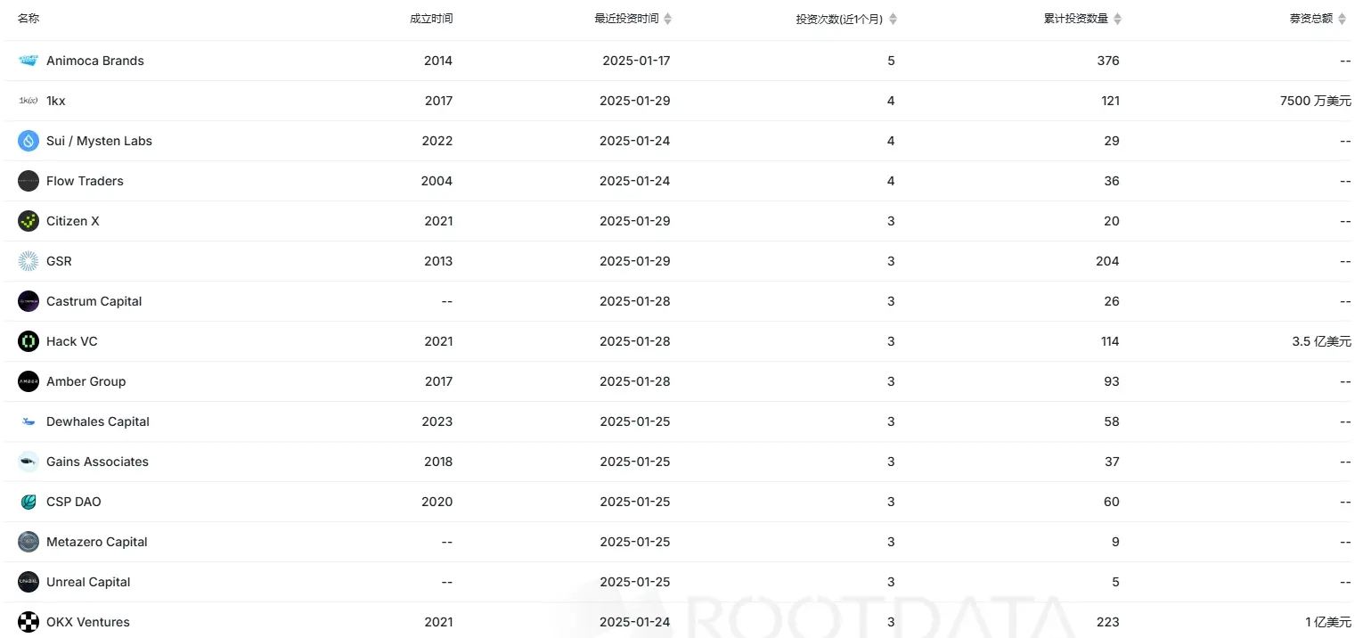 Animoca Brands 三次蝉联投资频次最高的风投机构,该机构近 3 个月的出手频次分别是 5 次、8 次、5次。 投资记录包括 Sui 流动性质押协议 Haedal 、 第 2 层扩展解决方案 zkCandy 、Berachain 生活模拟电子游戏 BeraTone 、数字广告平台 EarnOS 、TON 借贷协议 Evaa Protocol 等。