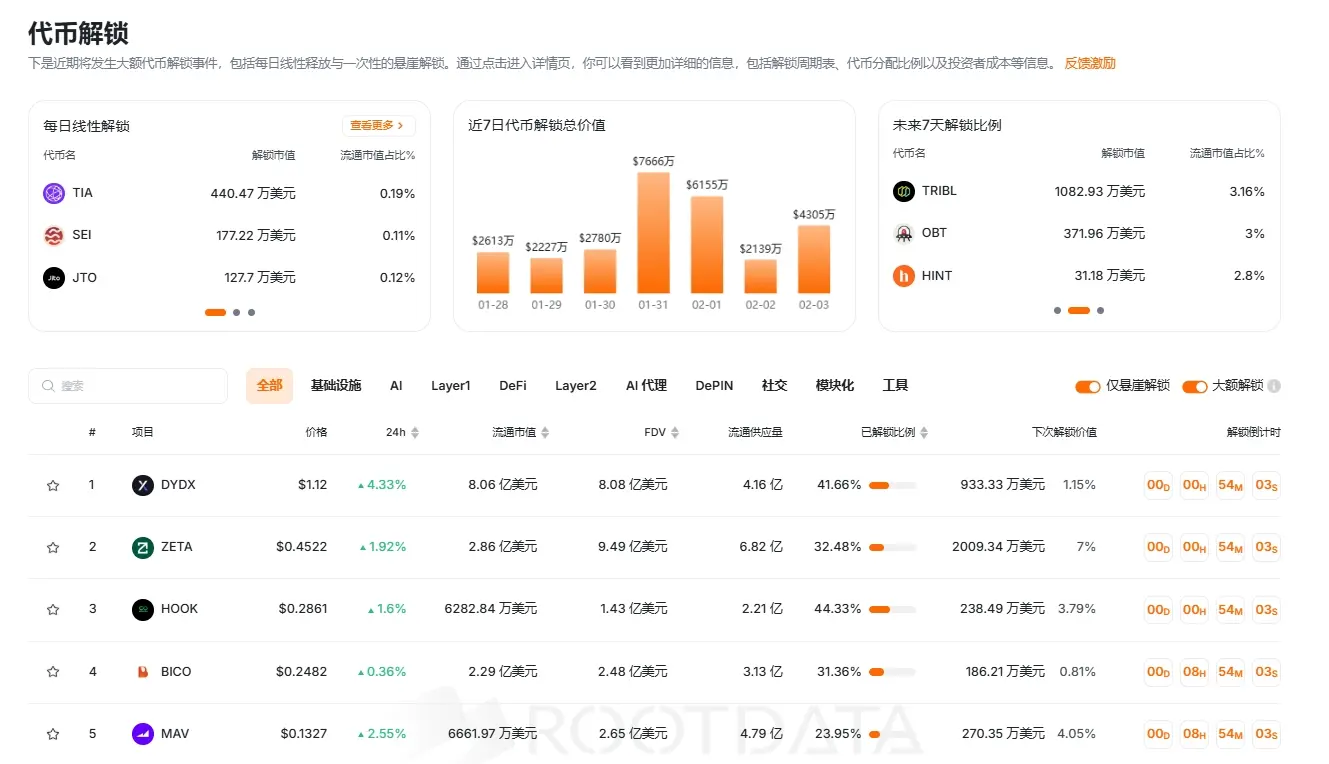 此外,RootData 上线代币解锁功能,帮助用户通过“热度榜”与全面的代币解锁信息,结合结构化项目一二级市场的基本信息,提升捕获投资信号的效率。