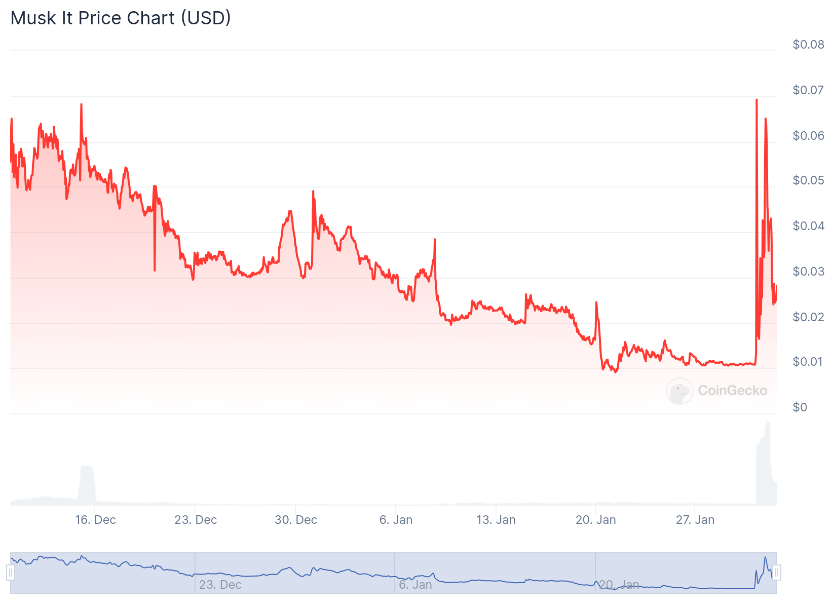 CoinGecko 数据 显示 ,$MUSKIT 自上缐以来价格不断走跌,但在 Errol Musk 周四公𫔭背书下,价格从 0.01 美元飙升至 0.07 美元,随后又回落,至截稿前,该迷因币价格为 0.02833 美元,市值为 2800 万美元,已较昨日最高点 0.07278 美元回落 62.3%。