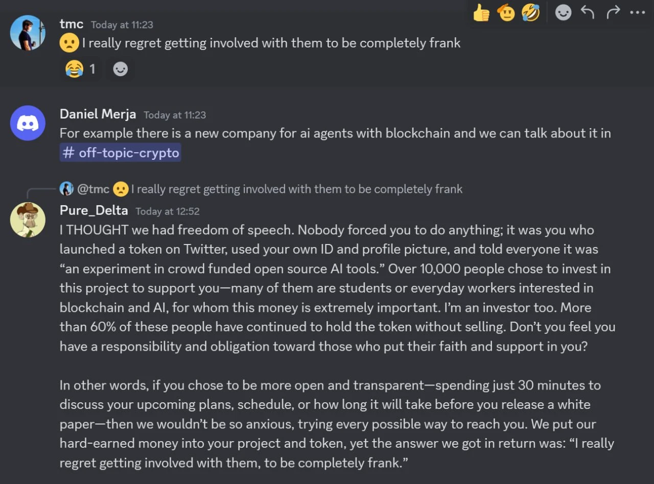 在此之后,数十位投资者尝试了各种渠道均未收到Travis任何回复。当投资者涌入Discord质问时,Travis粗暴的将这些人从频道移除,并删除了所有他们的留言,留下一句“后悔和加密人士打交道”并从此消失。