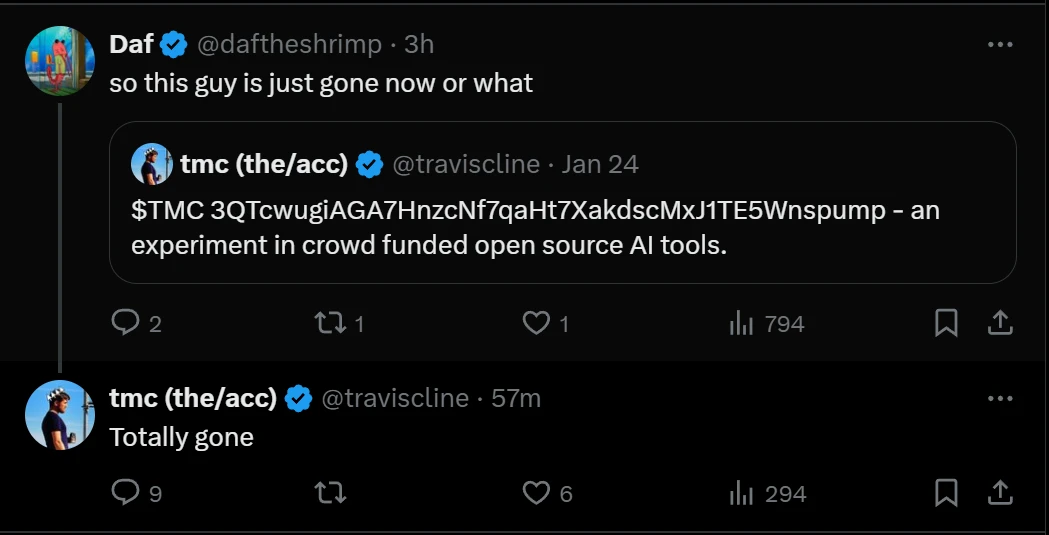但是不久之后Travis又在推特高调宣布:“TMC——一场众筹开源AI工具的革命实验。”大家意识到这不是一个meme coin,而是一个由英伟达核心团队成员发行的对公众募资的开源AI工具项目。同时,加密KOL @OKRenaissance通过私域渠道与Travis本人验证,确认了代币是由他本人发行。在大家知道TMC是Travis本人发行的时候,TMC又在市场上被疯狂抢购,市值一路冲到3000万美元以上。