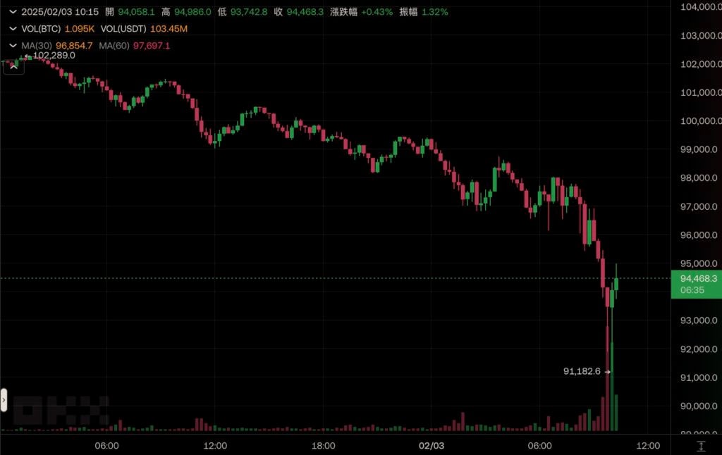 加 密市场在美国总统川普正式打响关税𢧐的背景下,稍早在接近十点时近一步扩大跌幅!比特币一度插针 91,182 美元,2025 年涨幅已经全数回吐。截稿前反弹至 94,468 美元,目前是否已经到达底部还有待观察,但是可以肯定的是市场中的杠桿又再次进行了一次大清洗。