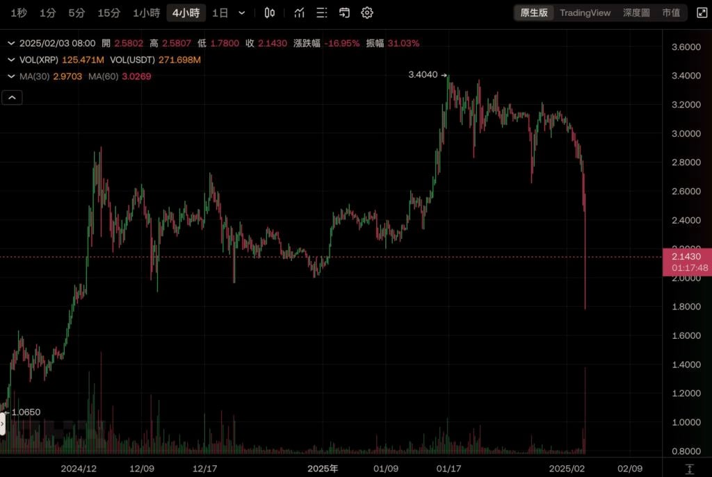 前十大代币中,跌幅最惨的就是 XRP,近 24 小时跌幅最大来到 40%,稍早一度插针 1.78 美元,回到去年 12 月的起涨点,可见有大量合约投资者爆仓。