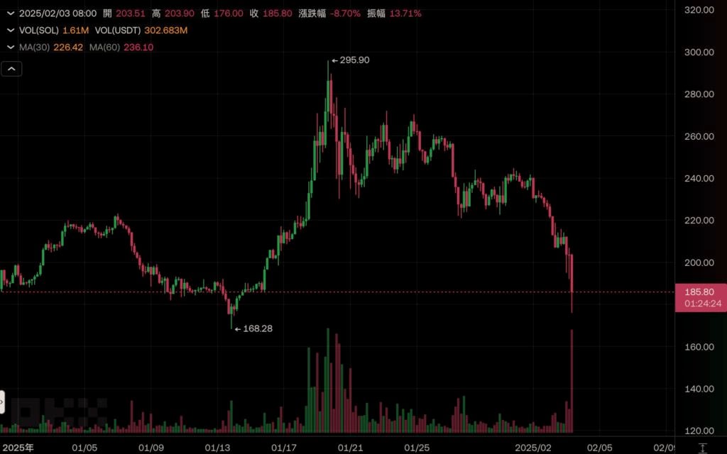 SOL 虽然也有大幅下跌,稍早最低来到 175 美元逼近一月低点,但是近 24 小时跌幅仍小于以太坊,目前暂报 185.8 美元。