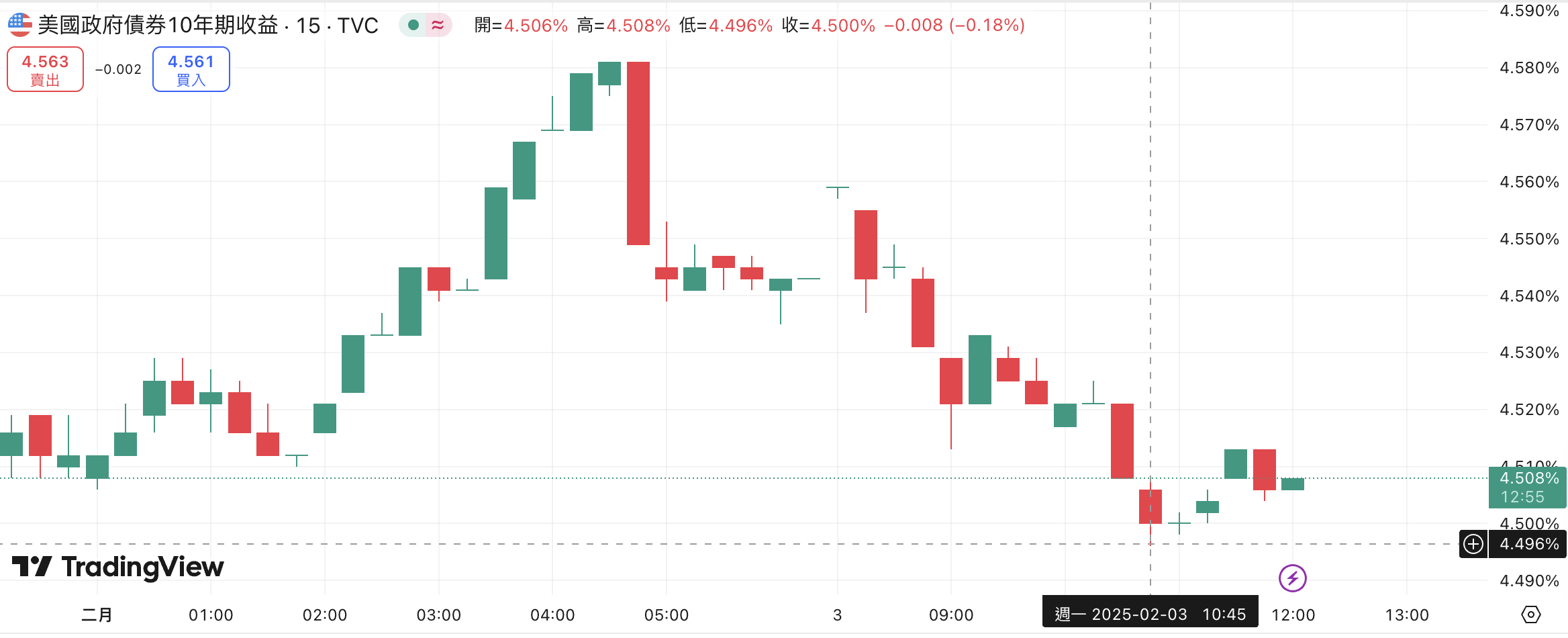 然而今日市场情绪急剧转变,10 年期美债殖利率一度急跌至 4.496%,较 1 月 31 日收盘暴跌 8.4 个基点,显示投资人避险需求骤增。