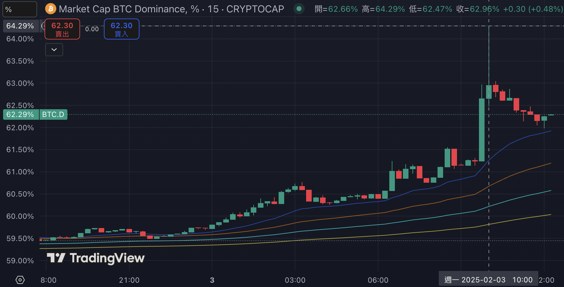在山寨币普遍遭到抛售的情况下,比特币市值占比(BTC.D)攀升至 64.29%,创下自 2021 年 2 月以来的新高。截稿前暂报 62.29%,过去 24 小时内上涨 2.66%。
