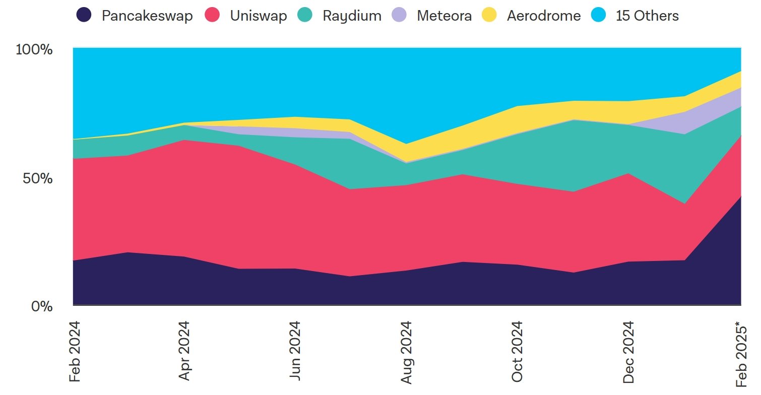 另外,PancakeSwap 在 1 月占 DEX 交易量的 17.23 % ,名列第三, Meteora 、Aerodrome 分别排名第四及第五,各自占 DEX 交易量的 8.72%、6.12%。