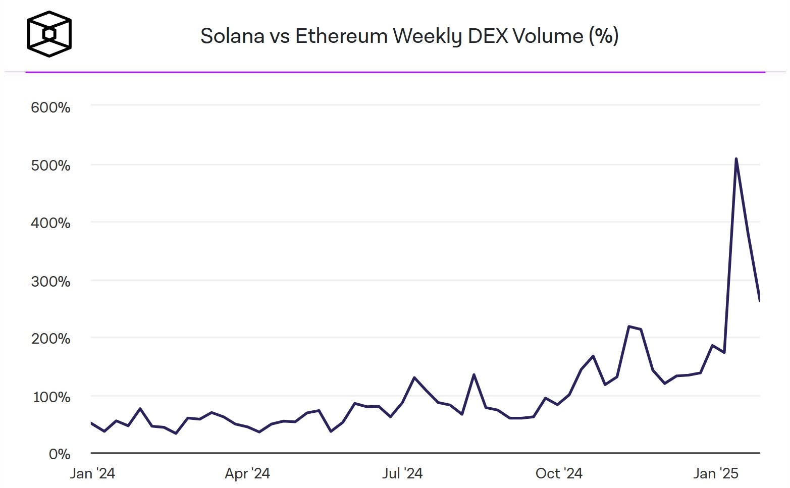 Solana 上的 DEX 交易量 1 月暴增,很可能得益于美国总统川普推出官方迷因币有关,该币上缐后掀起热潮,一度迅速跃升为市值排名靠前的加密货币之一。