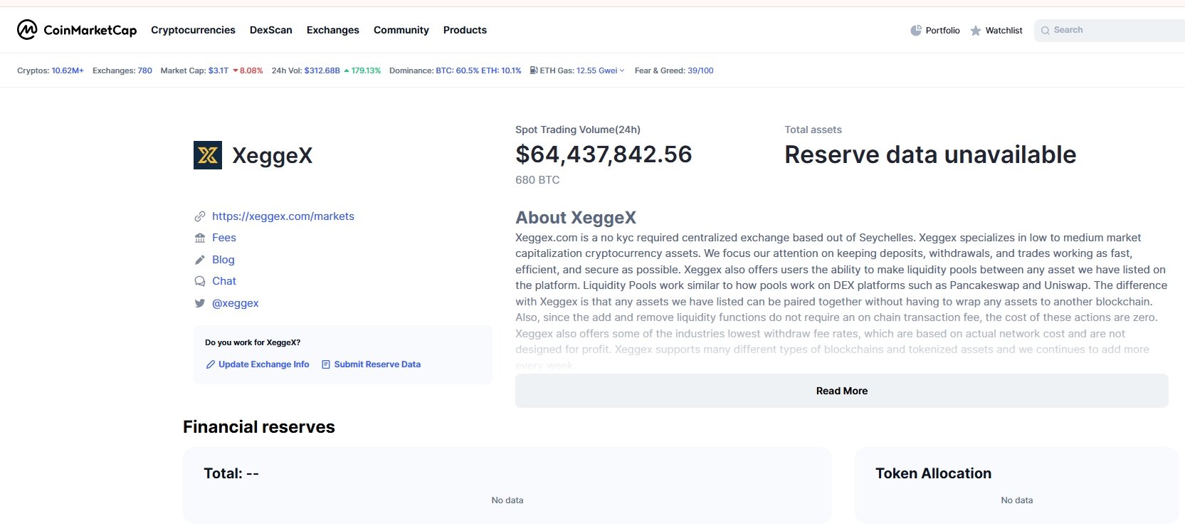 另外根据 CoinMarketCap 数据 ,Xeggex 交易所的储备证明数据未能正常显示,这可能是因为储备证明资产已被转移,或是交易所刻意切断 API 接口,导致无法读取剩馀资产数据…恐怕是凶多吉少。
