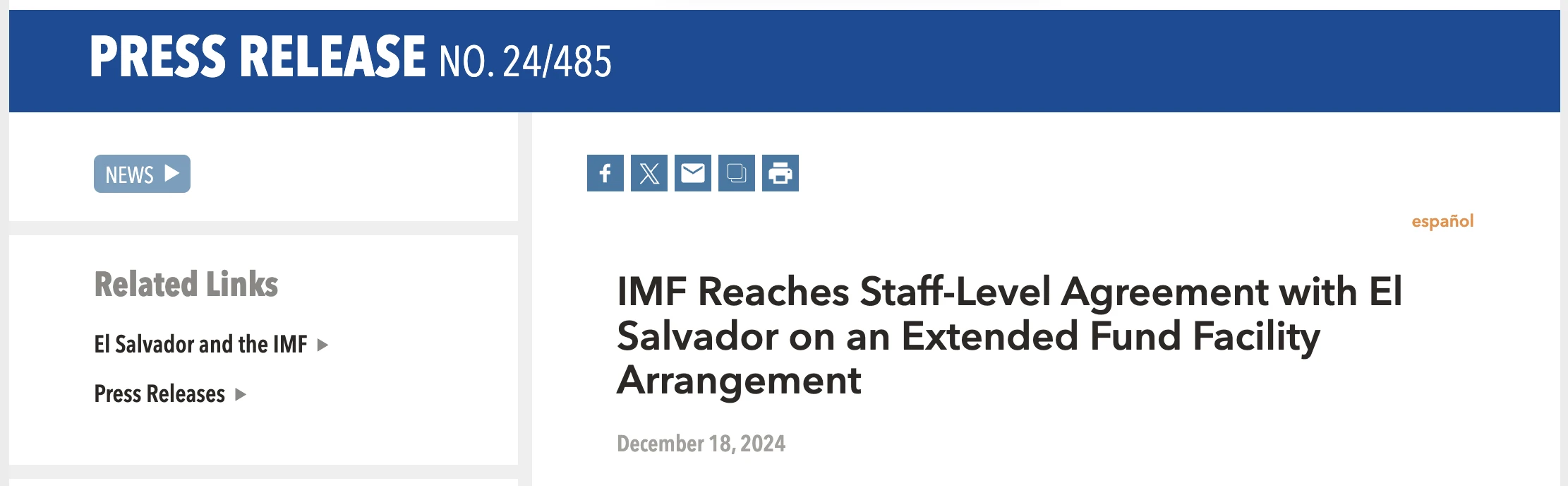继续回溯历史报导,会发现 IMF 官网早在 2024 年 12 月 18 日就曾对此事作出过相关宣告。该宣告由 IMF 西半球部副主任 Luis Cubeddu 和萨尔瓦多代表团团长 Raphael Espinoza 所率领的 IMF 工作团队于 2024 年 12 月 5 日至 14 日在萨尔瓦多讨论后联合释出 —— 换句话说,萨尔瓦多与 IMF 早在去年 12 月就已达成共识,确定将对比特币法案进行修改。