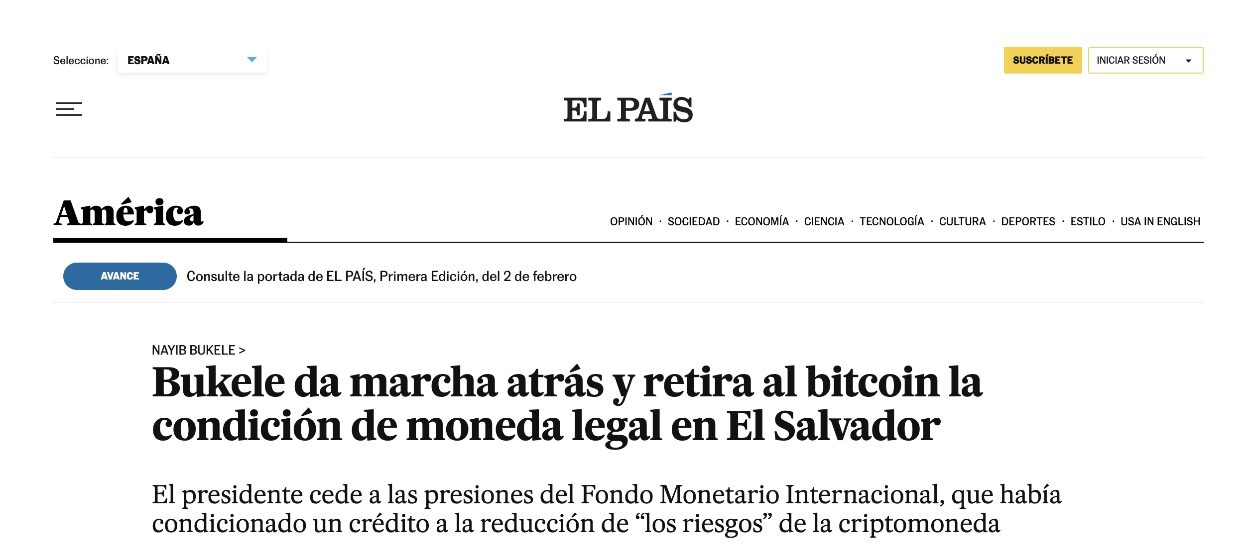 今日该事件之所以会以新的表述再次热炒并带崩市场, 原因在于部分媒体注意到了西班牙媒体 EL PAIS 的报导 —— 该媒体的原文标题为《Nayib Bukele 改变主意并取消了比特币在萨尔瓦多的法币地位》 —— 转载了加速了该事件的二次传播。