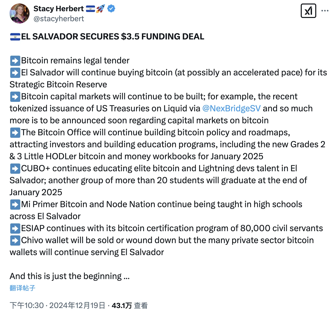 此外更重要的是,从 IMF 的官方宣告可知双方的最终谈判发生在 2024 年 12 月,宣告则是于 12 月 18 日作出。仅仅一天之后,ONBTC 主任 Stacy Herbert 就宣布萨尔瓦多将继续购𧹒比特币作为其𢧐略比特币储备,且可能会以更快的速度。