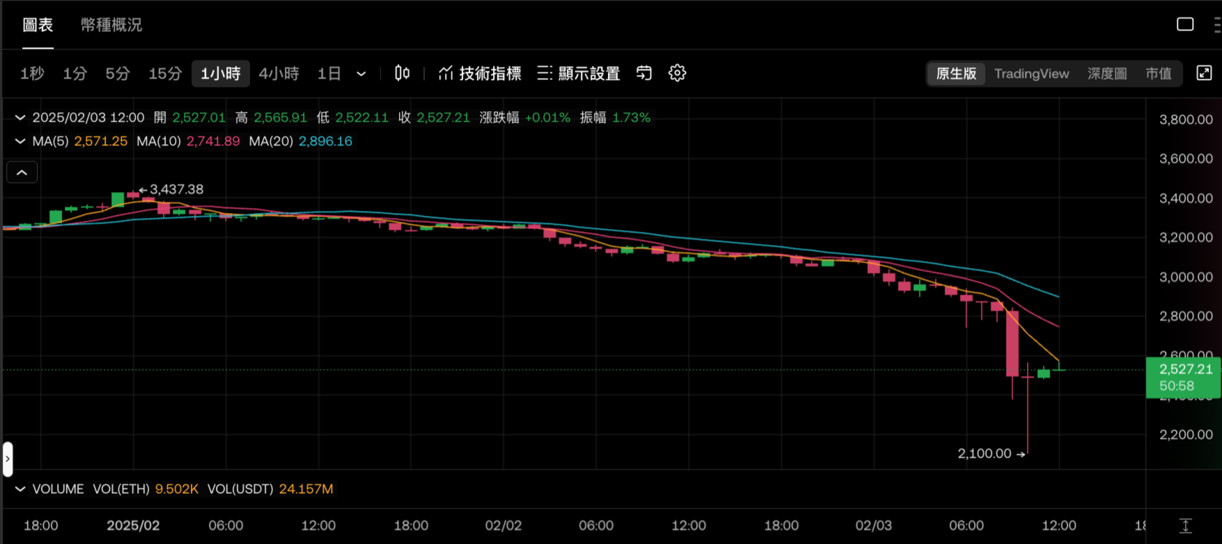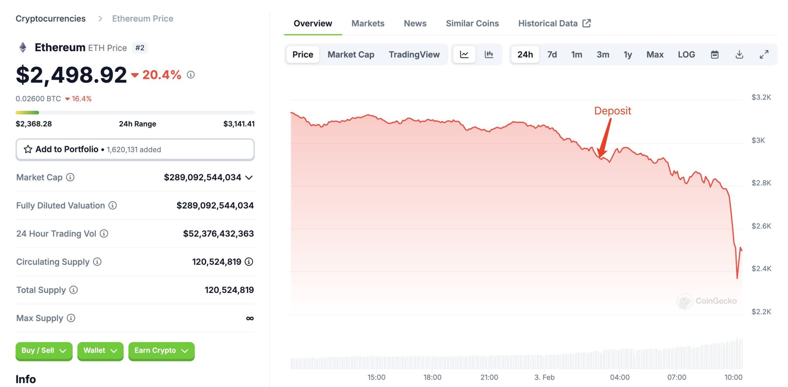 撰稿当下 ETH 回升至 2,527 美元,近 24 小时跌幅仍超过 18%。
