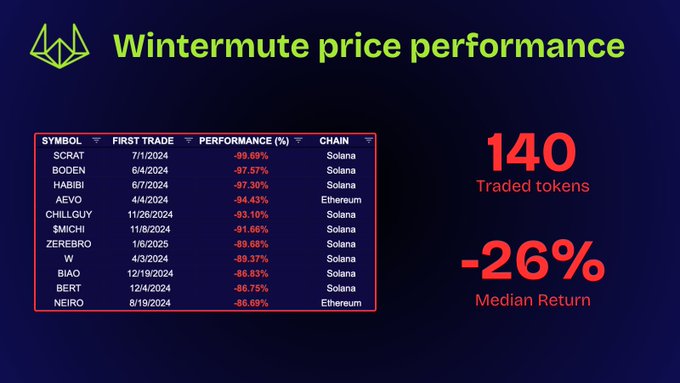 名的做市商 Wintermute 究竟是市场的流动性推手,还是散户的收割机?根据加密 KOL dethective 的数据 分析 ,自 Wintermute 参与交易的代币中,有 67% 的价格下跌,过去一年来,若投资他们负责做市或持仓的代币,平均回报率为 -26%。其中表现最差的包括 ZEREBRO、NEIRO、MOTHER,以及一篮子迷因币。