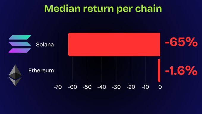 特别值得注意的是,Wintermute 在 Solana 上管理的代币表现更惨烈,回报率显著低于 Ethereum。这可能与 Solana 生态内充斥大量低品质迷因币有关,让市场更加混乱。