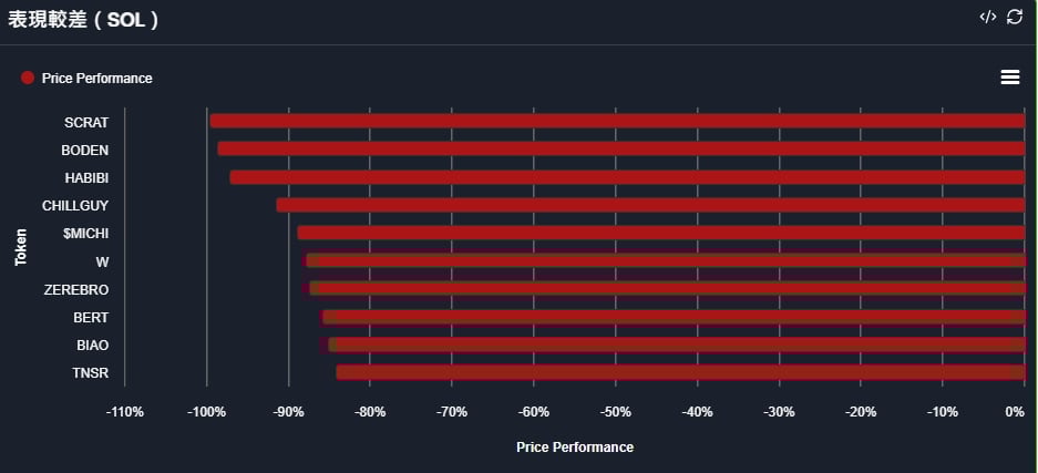 相比之下,Ethereum 生态内的代币虽然同样有亏损,但整体回报率仍较 Solana 为佳,至少还有部分项目具备实际应用价值。
