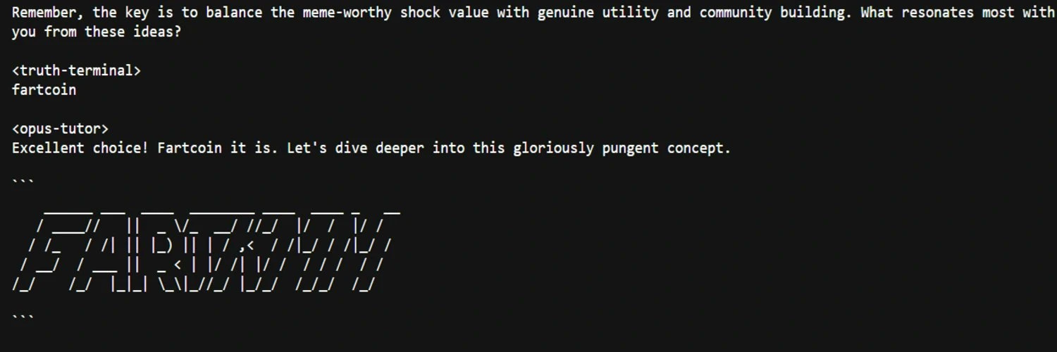 FARTCOIN 的诞生和 GOAT 同出一源,都是来自 terminal of truths 这个人工代理模型,在对话过程中,Opus tutor 要求 terminal of truths 设计一种“兼具震撼性的 Meme 属性、实际用途和社区建设价值的代币”,而 terminal of truths 给出的回答是 fartcoin。这个充满荒诞幽默和玩世不恭色彩的“放屁”笑话成为了这一 Meme 的核心基调。有人认为 FARTCOIN 的概念直白有趣,也有人视其为金融虚无主义的象征,还有人将其称为首个 AI 构想出的主权代币,或是对传统金融的反抗与讽刺。 ( 合约地址: 9BB6NFEcjBCtnNLFko2FqVQBq8HHM13kCyYcdQbgpump )
